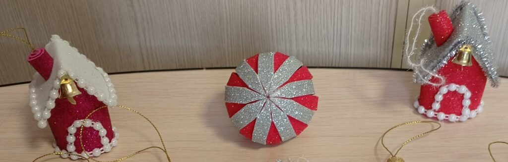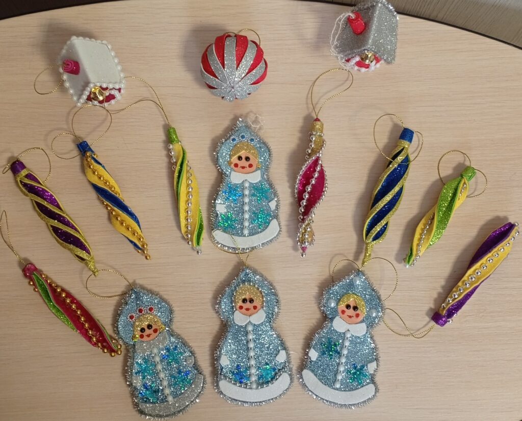 А наши мастерицы демонстрировали уже своих снегурочек, сосульки, шарики, домики.