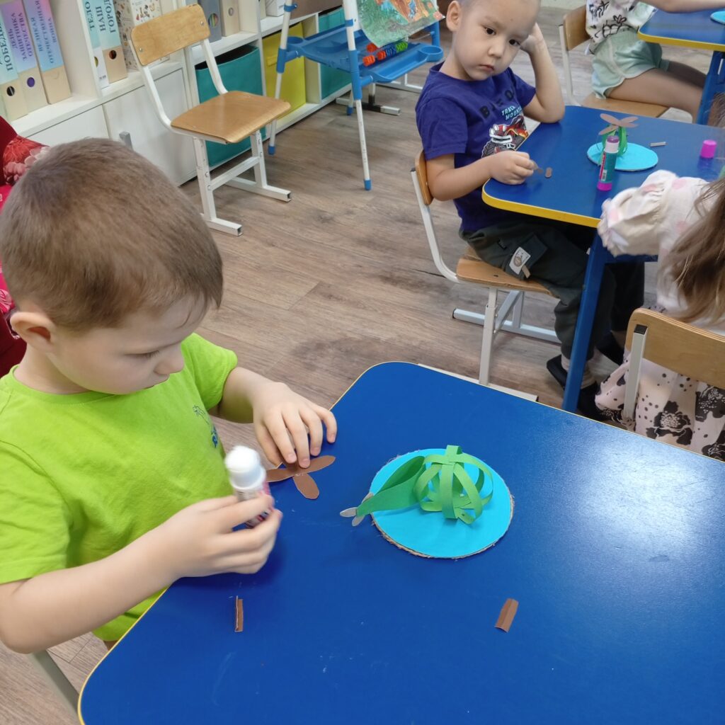 Вооружившись заранее приготовленными деталями вертолета, дети дружно взялись за работу.